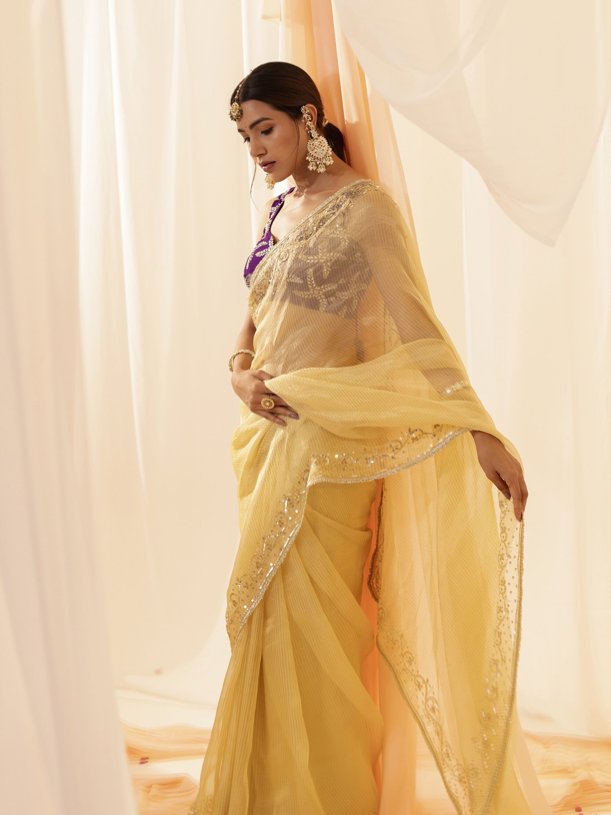 Opt for flowy chiffon or georgette sarees for breezy effects.